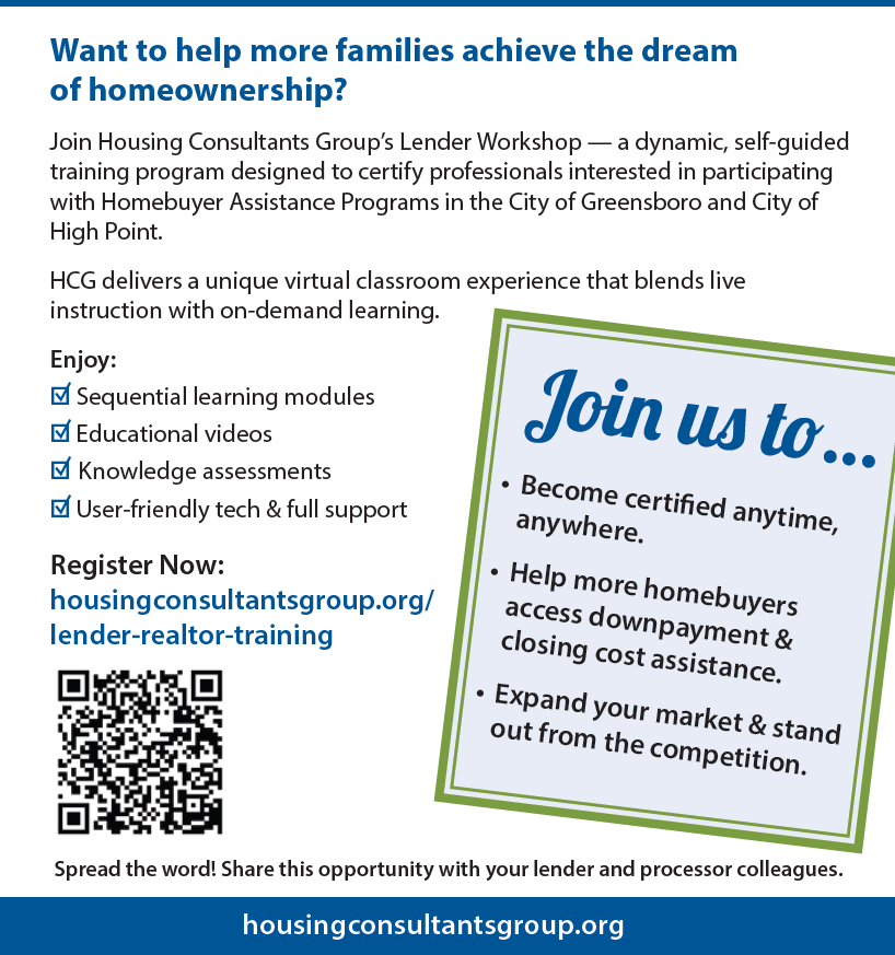 HCG has an extensive network of partners, including lenders, realtors, and housing professionals that embrace the importance of sustainable homeownership. HCG partners with lenders and realtors to provide critical training and application support for those interested in participating in the City of Greensboro and City of High Point Downpayment Assistance (DPA) Programs. Learn more and join our partnership.